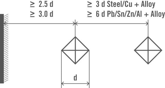 Rys. 1. Schemat przedstawiający minimalną odległość między odciskami (oraz odległość od krawędzi) wg normy ISO 6507 (źródło: https://www.emcotest.com)