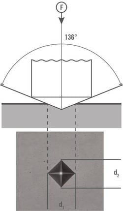 Rys. 2. Schemat diamentowego wgłębnika Vickersa oraz odcisku powstającego po pomiarze (źródło: https://www.emcotest.com)