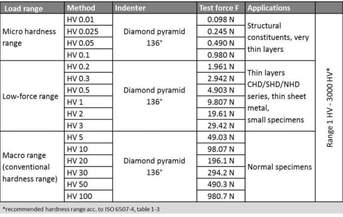 Tab. 1. Zastosowanie różnych obciążeń w metodzie Vickersa (źródło: https://www.emcotest.com)